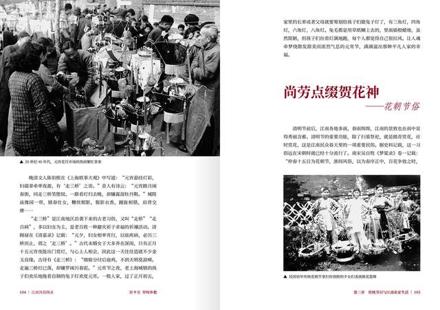 《江南风俗图录》以十大主题分卷,搭建起江南民俗的完整谱系:从风味饮食的稻麦鲜香、服饰冠履的经纬讲究,到民居建筑的黛瓦粉墙、行旅交通的舟楫马蹄;从生产商贸的市井吆喝、文教卫生的蒙学医案,到娱艺体育的丝竹竞技、人生礼仪的婚丧嫁娶,再到岁时乡情的节令流转、生活信仰的香火祈愿。每一卷皆以“老照片+民俗画作+江南竹枝词”形成互文叙事,生动还原市井烟火气与传统节庆,让沉睡的史料焕发生活温度——如解读婚俗时,以“妾在船头偷看郎,郎骑白马好风光”的竹枝词牵出迎亲船队的老照片,既以诗意笔触为学术研究注入美感,又借民间话语填补正史记载的细节空白,让百年前的嫁娶场景跃然纸上。