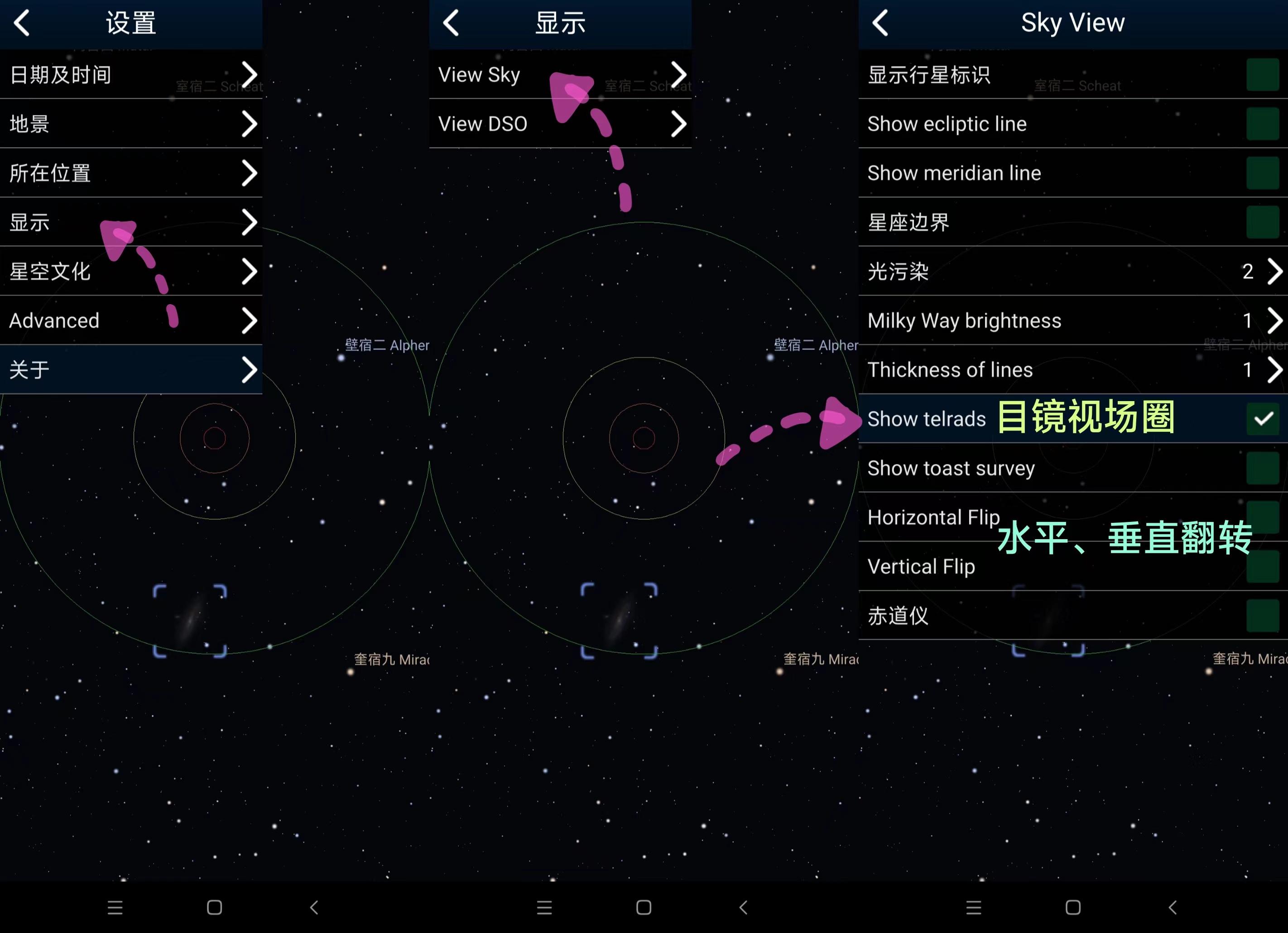 可以模拟寻星镜与目镜视场圈。中间4个圈大小是固定的,分别是1、3.2、7.5、20度直径。使用目镜或者寻星镜时可以参照这些圈的视场大小范围对比看到的星体。