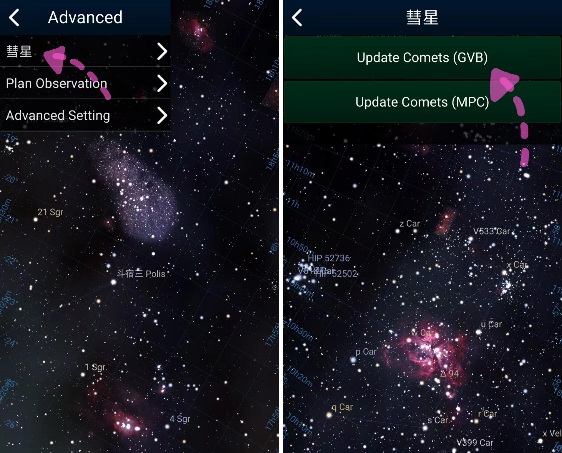 具体方法:进入设置,打开Advanced页面,进入彗星,推荐点击第一个Update Comets(GVB)之后,数秒钟内会完成彗星联网更新。Update Comets(MPC)同样可以更新,只是数据源不同。