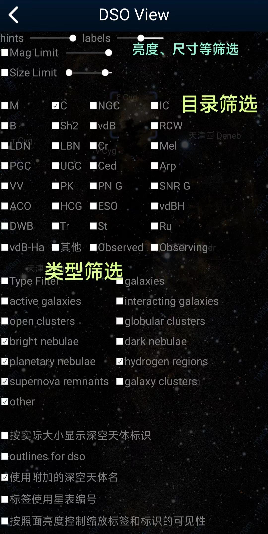 可以通过目录勾选、亮度和尺寸限制筛选、类型筛选等等控制不同深空的显示。方法:进入设置,打开显示页面,进入View DSO,勾选选项和滑块进行筛选,参考PC版Stellarium。