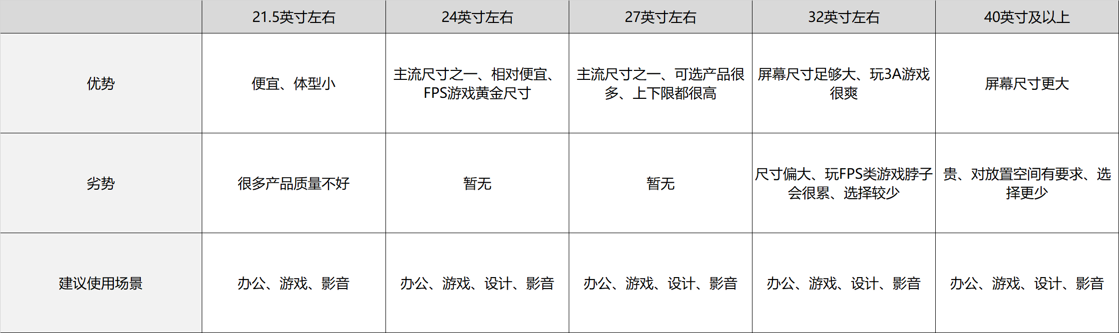 关于显示器尺寸这里,目前主流显示器尺寸有从21.5英寸到32英寸,当然还有大于32英寸的各种尺寸,但根据经验大部分人需要考虑的其实也就是24英寸和27英寸级别的显示器