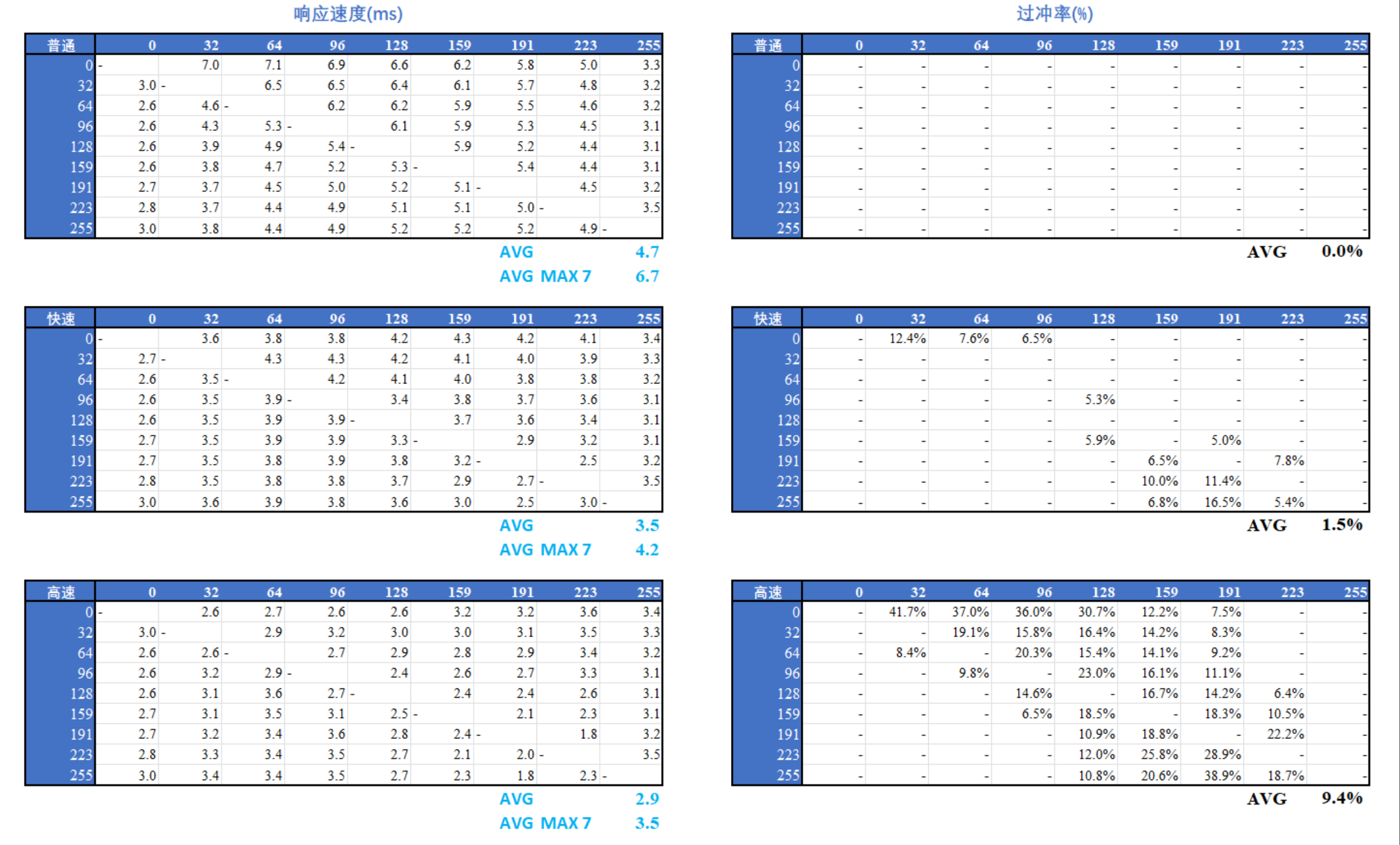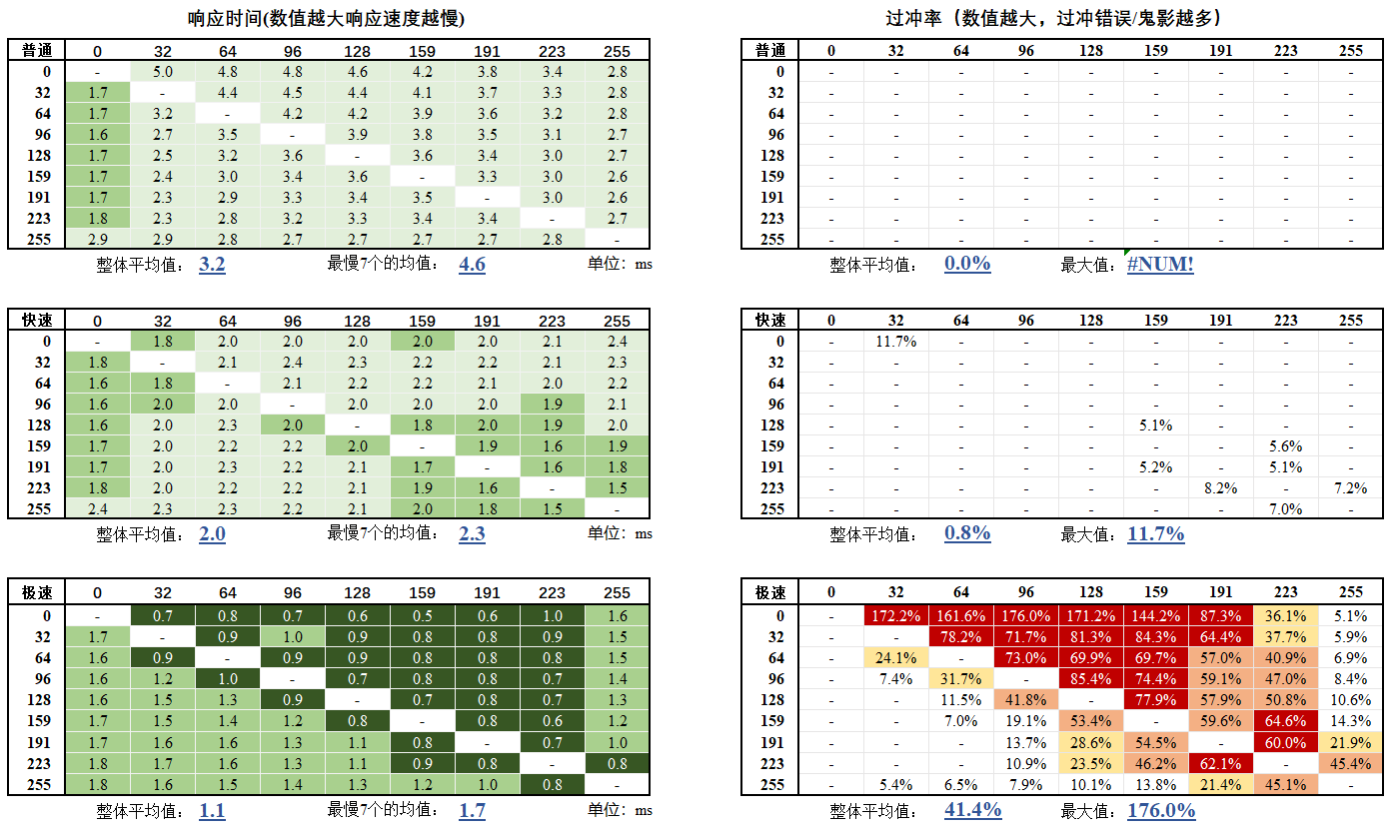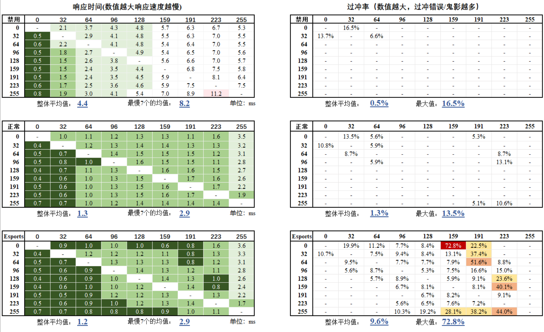 上面这几张图分别有响应时间(左)和过冲率(右),如果响应时间太高,在玩游戏的时候就可能会拖影明显