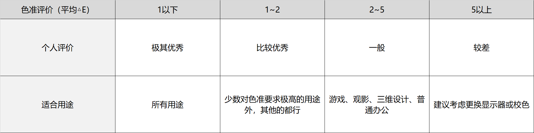 一般平均△E在2以下且最大△E在5以下的显示器都可作为设计用途的入门级标准,这个数据越低越好,专业设计显示器在这方面的表现都很强,少数游戏显示器调教的好也可以做到色准表现极佳。