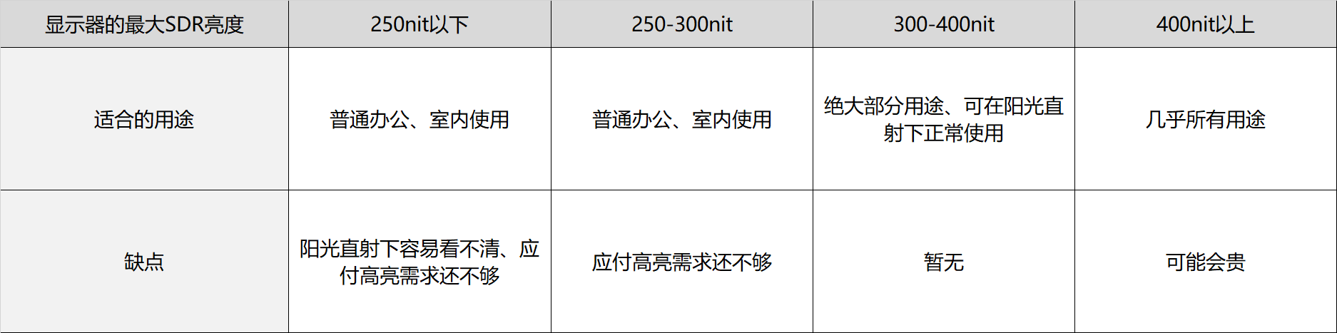 SDR亮度就是普通人需要调节的显示器亮度,亮度越高意味着在光线充足的地方越容易看得清画面细节,一般来说适合普通人日常使用的亮度大概在100-200尼特之间,几乎所有显示器都可以达到,如果你的使用环境比较亮的话这个标准还要往上提升,具体多少亮度适合使用因人而异,一般只有电影、3A大作以及HDR相关内容制作的用途会对亮度需求略高一些