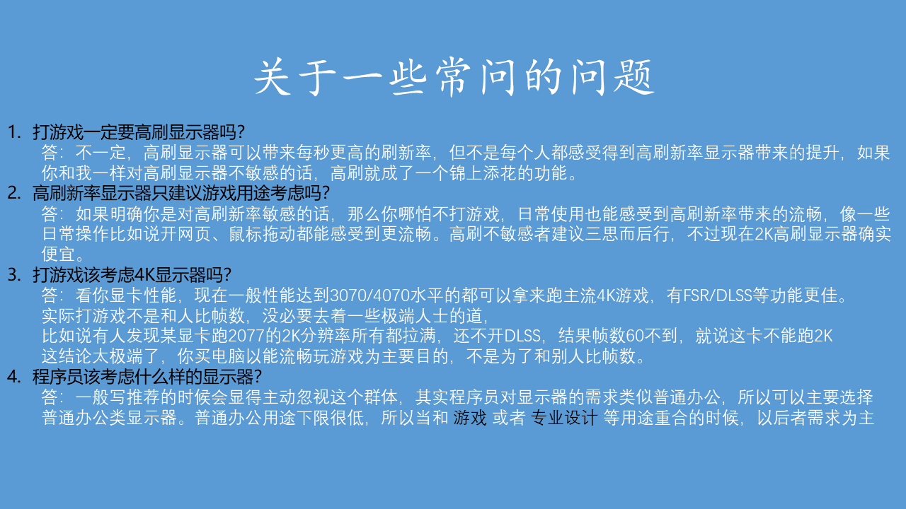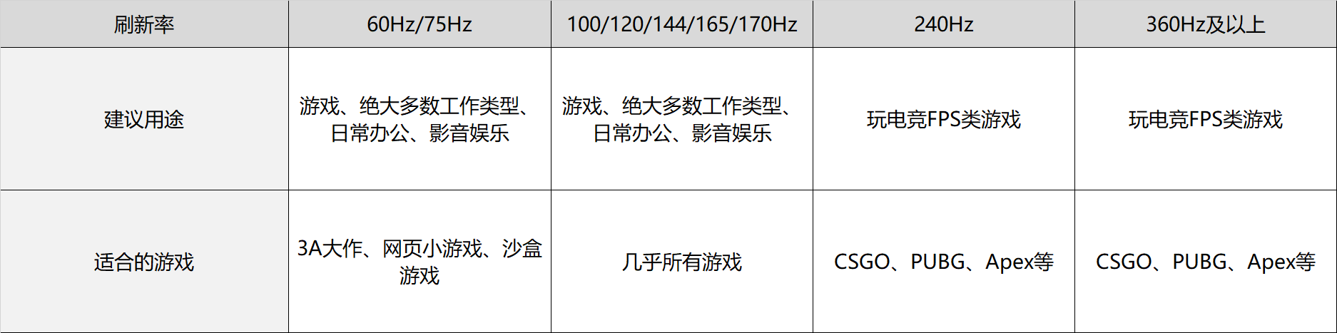 刷新率是显示器每秒最大可刷新的画面次数,一般来说越高越流畅,目前240Hz及以上刷新率的显示器仅建议用在主玩FPS类游戏的用途,其他用途可以不考虑这么高刷新率的显示器
