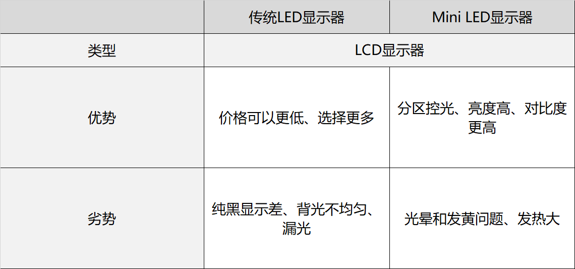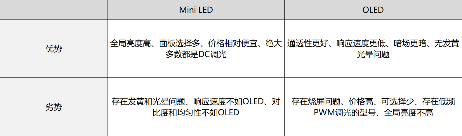 miniLED的价格便宜不少且全局亮度高,缺点是发黄和光晕问题,而OLED则是在HDR内容、屏幕响应时间以及对比度上强很多,双方也均有一些缺点,大家了解一下就好