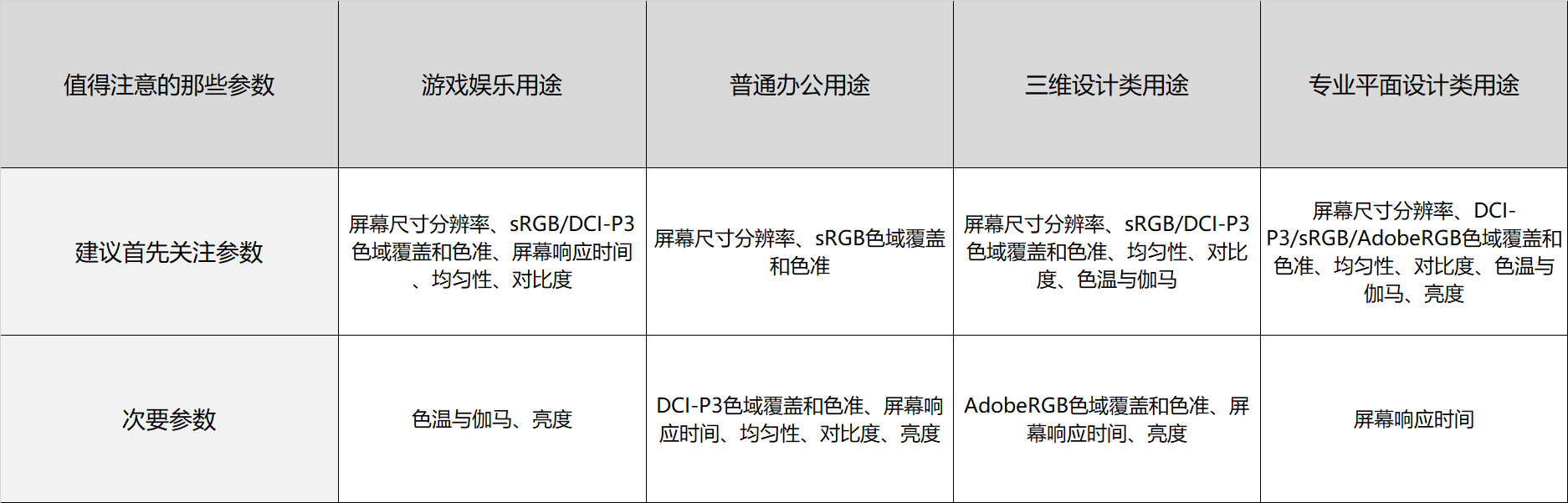 最后是关于主流用途建议首先关注的参数和次要关注参数,这张图大家一定要仔细看