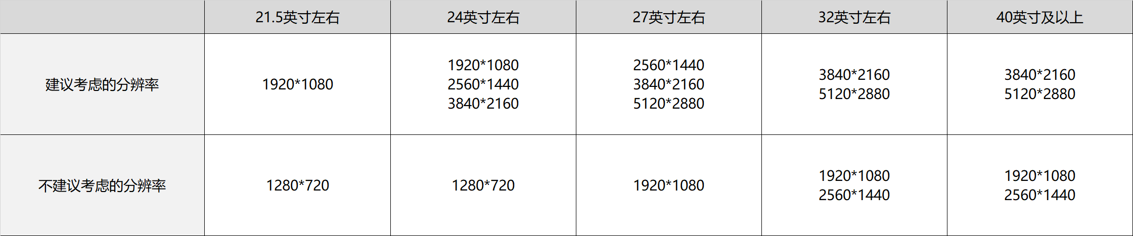 尺寸对应的分辨率问题,这是我列出来的尺寸和分辨率的搭配关系表,其中红色框框圈记的这些组合是适合大部分人选择的,也是产品最多的