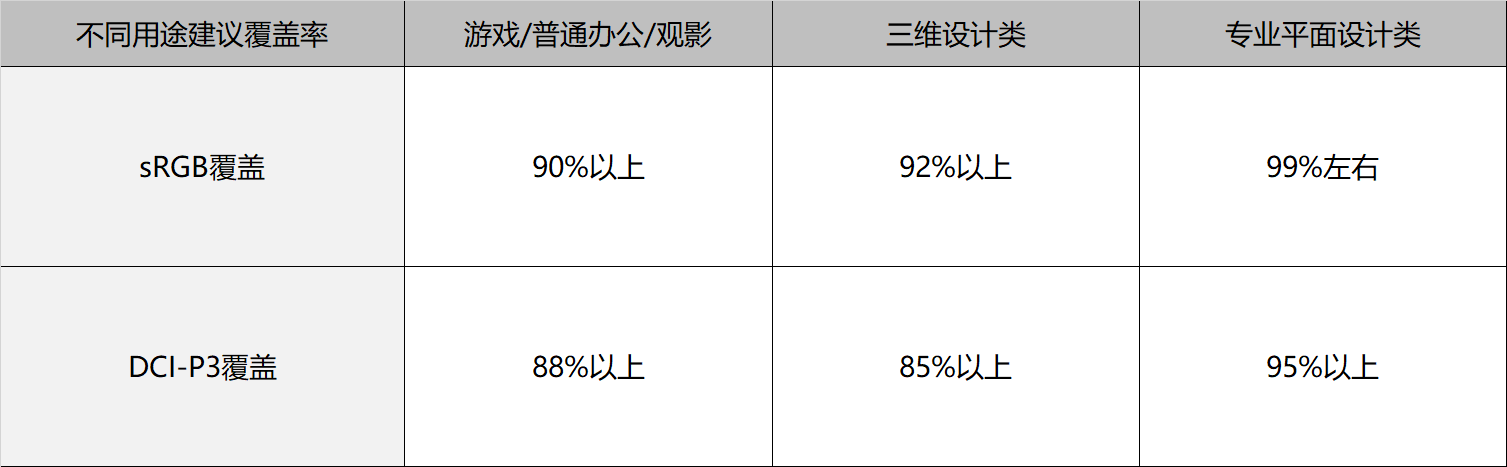 所以再来看这个表格,这是我针对不同用途对sRGB和P3色域的要求,我做了一个表格给大家参考